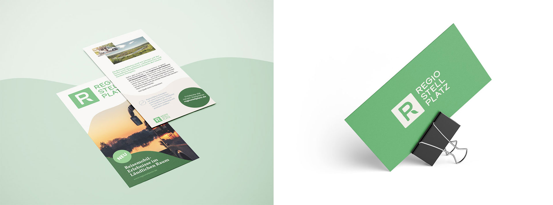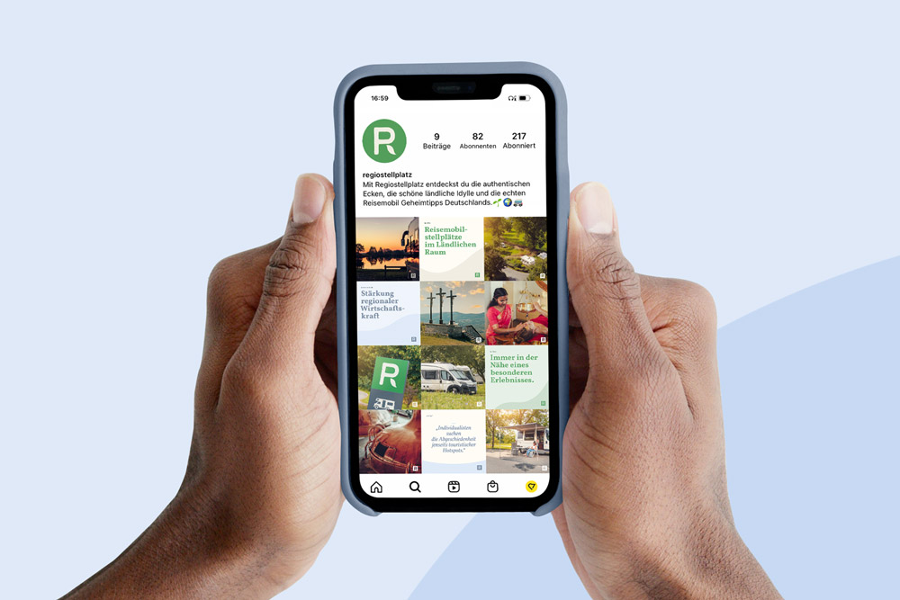 Für das Logo haben wir die Symbolik des bekannten blauen Parkplatz-Schildes genutzt und für unsere Zwecke umgebaut. Das Blatt visualisiert den Bezug zur Natur und formt so ein »R«, das für Regiostellplatz steht. Das Ergebnis ist ein unverkennbares Logo, das den Nagel auf den Kopf trifft – Stellplätze für Reisemobile im ländlichen Raum.