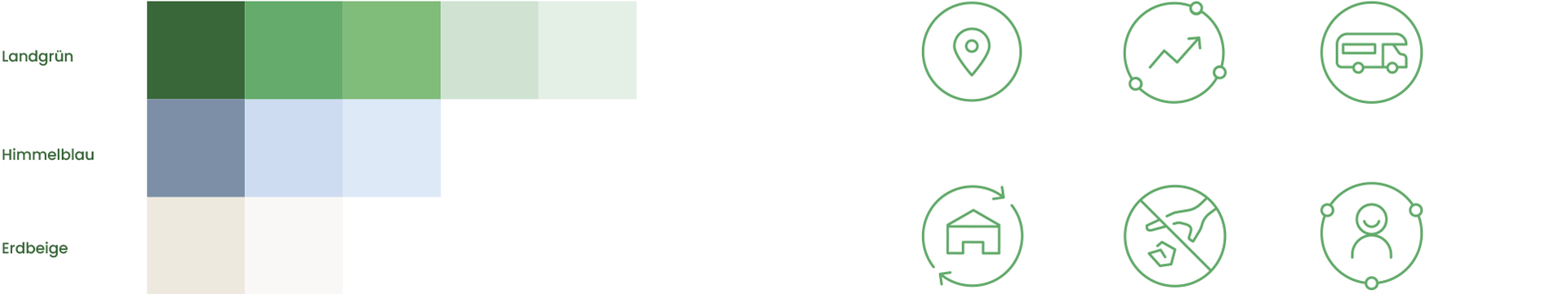 Die Farbtöne Grün, Blau und Beige wirken natürlich. Die sympathisch anmutende Schrift »Poppins« ist entsprechend der Charakteristiken »aktiv und aufgeschlossen« ausgewählt, während die aufeinander abgestimmten Farbtöne Grün, Blau, Beige und die grafische Welt den ländlichen Raum repräsentieren und den Nachhaltigkeitsaspekt unterstreichen.