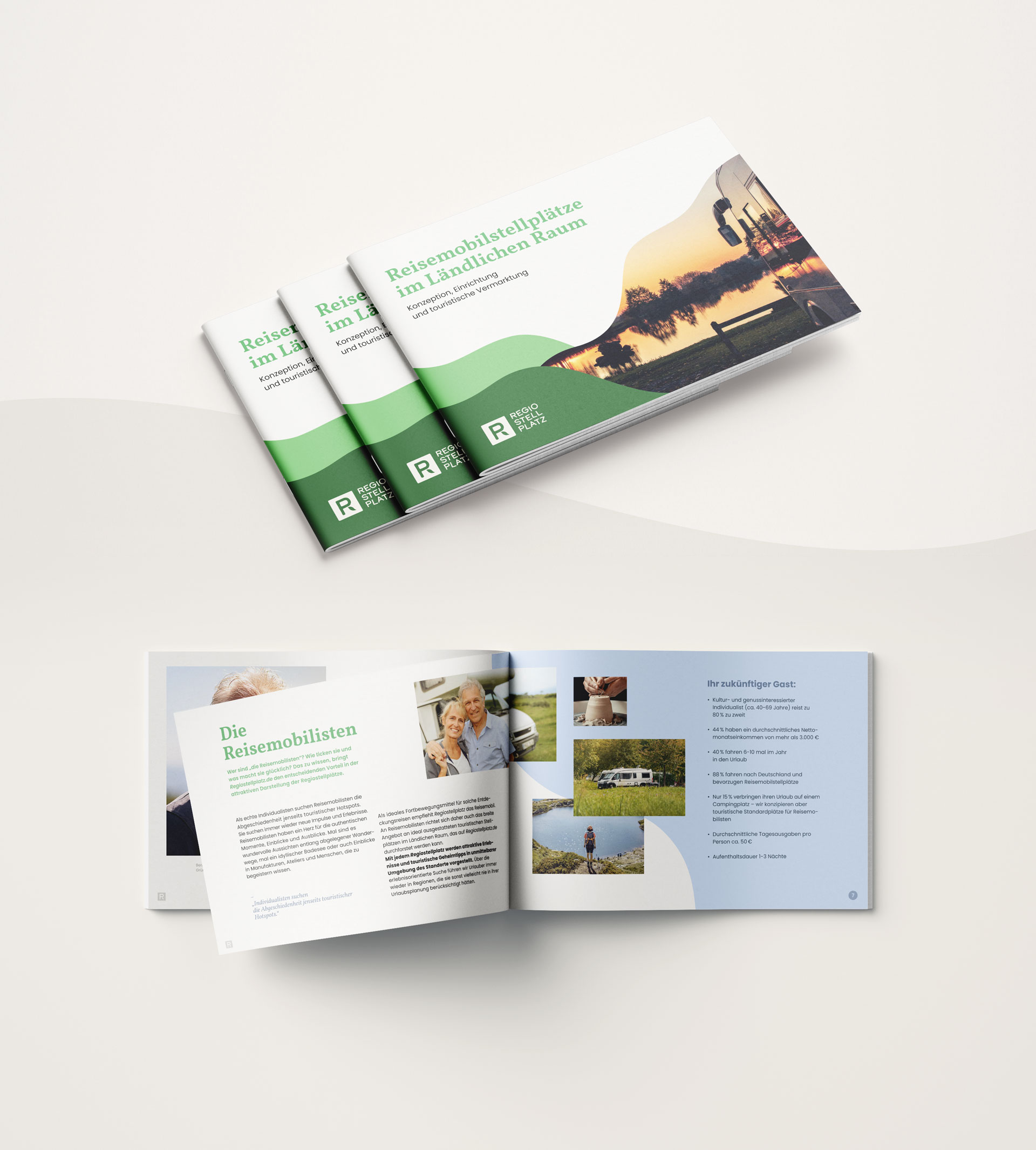 Wir haben die Symbolik des bekannten blauen Parkplatz-Schildes genutzt und für unsere Zwecke umgebaut. Das Blatt visualisiert den Bezug zur Natur und formt so ein »R«, das für Regiostellplatz steht. Das Ergebnis ist ein unverkennbares Logo, das den Nagel auf den Kopf trifft – Stellplätze für Reisemobile im ländlichen Raum.